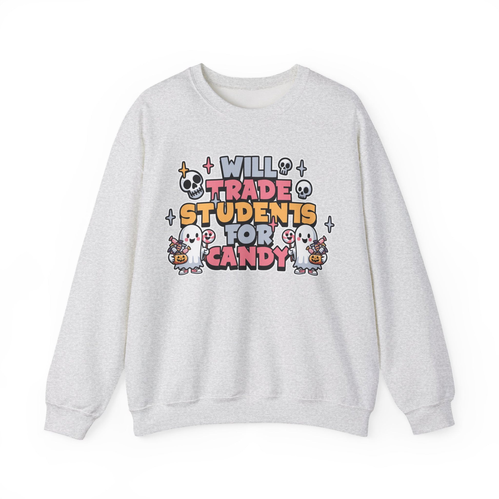 Stay cozy and stylish with this unisex heavy blend sweatshirt, perfect for anyone looking to add a playful twist to their wardrobe. Featuring a light-hearted graphic that reads, 'WILL TRADE STUDENTS FOR CANDY', this sweatshirt radiates fun and humor, making it an ideal choice for teachers, educators, or anyone who loves Halloween vibes. The classic crewneck style is versatile enough to wear during chilly days at school events, casual outings, or festive gatherings. This sweatshirt is not just a piece of clothing but an expression of personality and warmth, making it a fantastic gift for friends and family during the Halloween season or as a lighthearted birthday present. Embrace comfort without sacrificing style, and enjoy the laughter it brings while creating memorable moments!